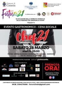 L’evento, “Chef 21“, si terrà, sabato 28 marzo 2026, presso l’Opera Salesiana Sacro Cuore Catania – Barriera, Via Del Bosco 71, Catania, diretta da Padre Giovanni D’Andrea. Attraverso il linguaggio universale del cibo, l’associazione, intende abbattere le barriere e promuovere una cultura dell’accoglienza, coinvolgendo la cittadinanza in un’esperienza condivisa che valorizzi le abilità e il potenziale di ogni persona.