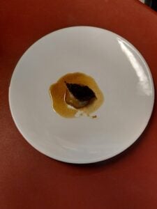 Il primo piatto ha messo in luce il talento della giovane Giordana Iuppa, nipote di Angelo Iuppa, titolare dell’Azienda Agricola di famiglia. Da sei mesi alla guida gastronomica del ristorante Ostier, Giordana ha presentato Periferia, ispirato ai ricordi d’infanzia trascorsi nei campi di Caronia. Il suo approccio, orientato allo zero waste, valorizza gli “scarti” di cucina: in questo caso il cavolo trunzo, presidio Slow Food. Il tortello, farcito con le foglie e le parti meno nobili della verdura amalgamate con ricotta, è completato da una chip di cavolo essiccata al forno e da un fondo speziato al cardamomo, sempre a base di trunzo. In abbinamento, Etna Rosato Contrada Cavaliere 2021 e Etna Rosso 2019 (Nerello Mascalese 100%) di Travaglianti.