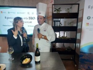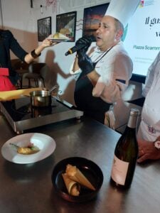 Terza proposta della giornata, il Soffice alla catanese dello chef e docente dell’IPSSEOA “Giovanni Falcone” di Giarre, Rosario Cantarella. Una crocchetta di ricotta con pane raffermo tagliato al coltello, limone, miele e zafferano, arricchita dalle fave di Modica. In abbinamento, Etna Bianco Tenuta San Michele 2023 di Murgo (Caricante 60%, Catarratto e altre uve 40%).