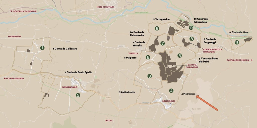 La storia di Tornatore nasce molto prima che l’Etna diventasse un nome pronunciato con reverenza: una famiglia contadina, un palmento, vigne custodite come si custodiscono i cicli naturali. Oggi la cantina è moderna, ampia, ma resta fedele a un’idea agricola del vino, fatta di contrade lette una per una. Pietrarizzo è tra le più ariose: qui il Carricante cresce alto, lento. È un vino che non cerca effetti, piuttosto accompagna i passaggi dalla freschezza alla profondità con una calma antica.