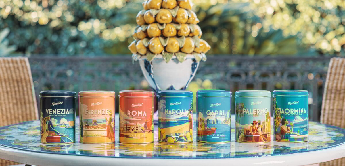 “The Italian Grand Tour” è un omaggio all’Italia e al suo stile di vita, alla bellezza e al gusto del vivere italiano. Morettino, storica torrefazione siciliana, firma una capsule collection composta da sette miscele di caffè macinato fresco racchiuse in eleganti latte da collezione dedicate a sette città simbolo della cultura e dello stile di vita italiano: Venezia, Firenze, Roma, Napoli, Capri, Taormina e Palermo, le città scelte per questo racconto per immagini da cartolina, evocative e allo stesso tempo iconiche testimonianze di un’Italia felice. Le confezioni sono decorate con illustrazioni originali ispirate ai manifesti turistici degli anni ’50, reinterpretati in chiave contemporanea: immagini che compiono il viaggio, appunto il Grand Tour, con la luce delle piazze, il mare e le architetture che hanno nutrito l’immaginario del mondo sulla Dolce Vita e il cinema.