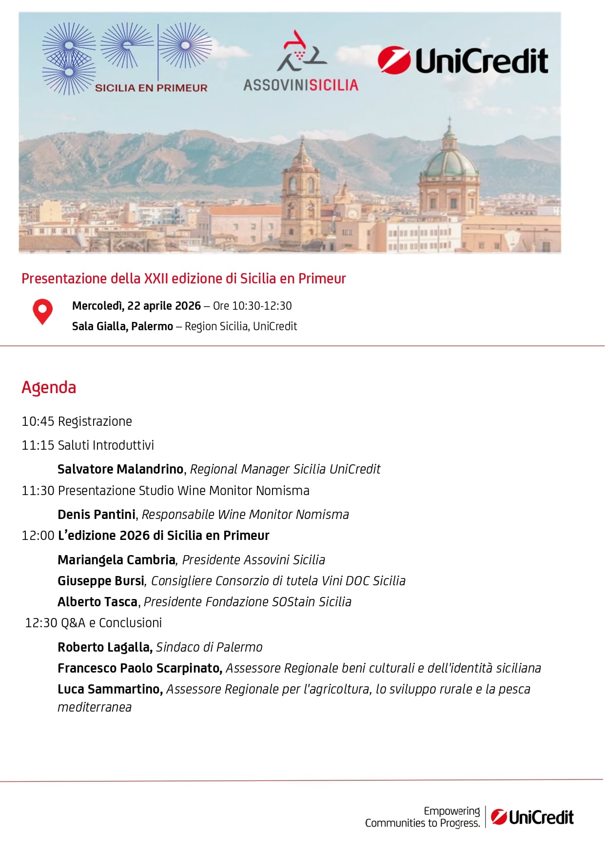 Dopo la registrazione dei partecipanti, i lavori saranno aperti dai saluti istituzionali di Salvatore Malandrino, Regional Manager Sicilia di UniCredit. Seguirà la presentazione dello studio Wine Monitor Nomisma a cura di Denis Pantini, momento dedicato all’analisi dei principali dati economici e delle tendenze del settore vitivinicolo.