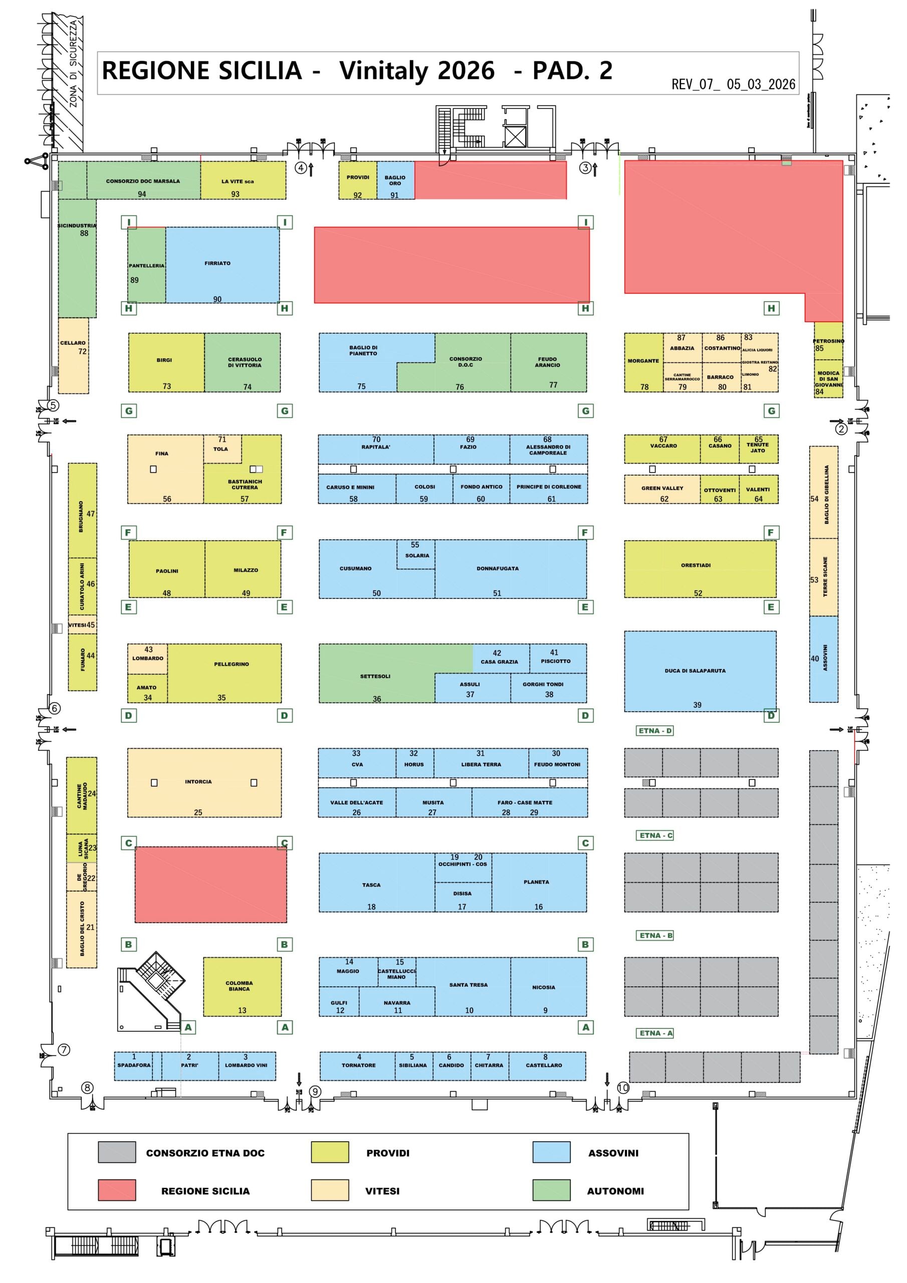 Attorno a questo asse istituzionale si dispongono le macroaree del padiglione: il Consorzio Etna Doc, Providi, Assovini Sicilia con 47 aziende, Vitesi e la presenza diffusa di aziende autonome.